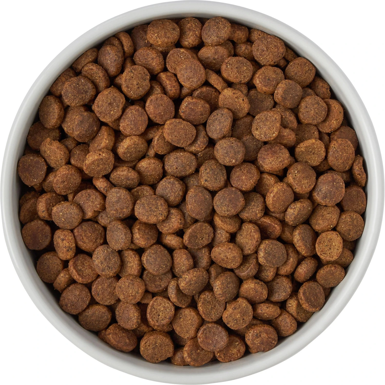 - Simple, white ceramic pet bowl with modern, black “food” graphic on the side.