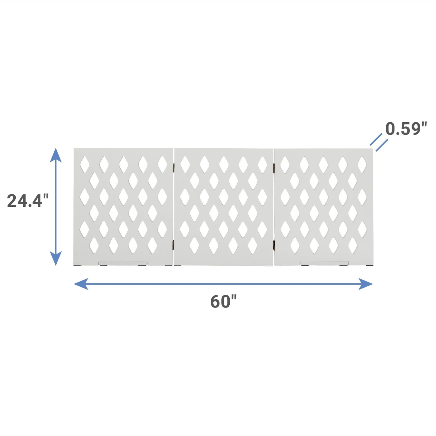 Try a different take on pet gates with the Frisco Deco Diamond Shape 3-Panel Pet Gate. This folding, three-panel design works as a freestanding gate or room divider wherever you need to create a pet-safe space in your home. It’s 24 inches tall, so it’s perfect for extra-small, small and medium-size breeds, and it features two swiveling, sturdy support feet that add extra stability. It comes preassembled and requires no tools to use—just bring it wherever your pet needs a little space of their own, unfold it and turn the support feet. Plus, it adds to your home décor and features a deco design style with diamond cutouts and two color options—clean white or rich espresso—so you can find the right fit for any room of your home.