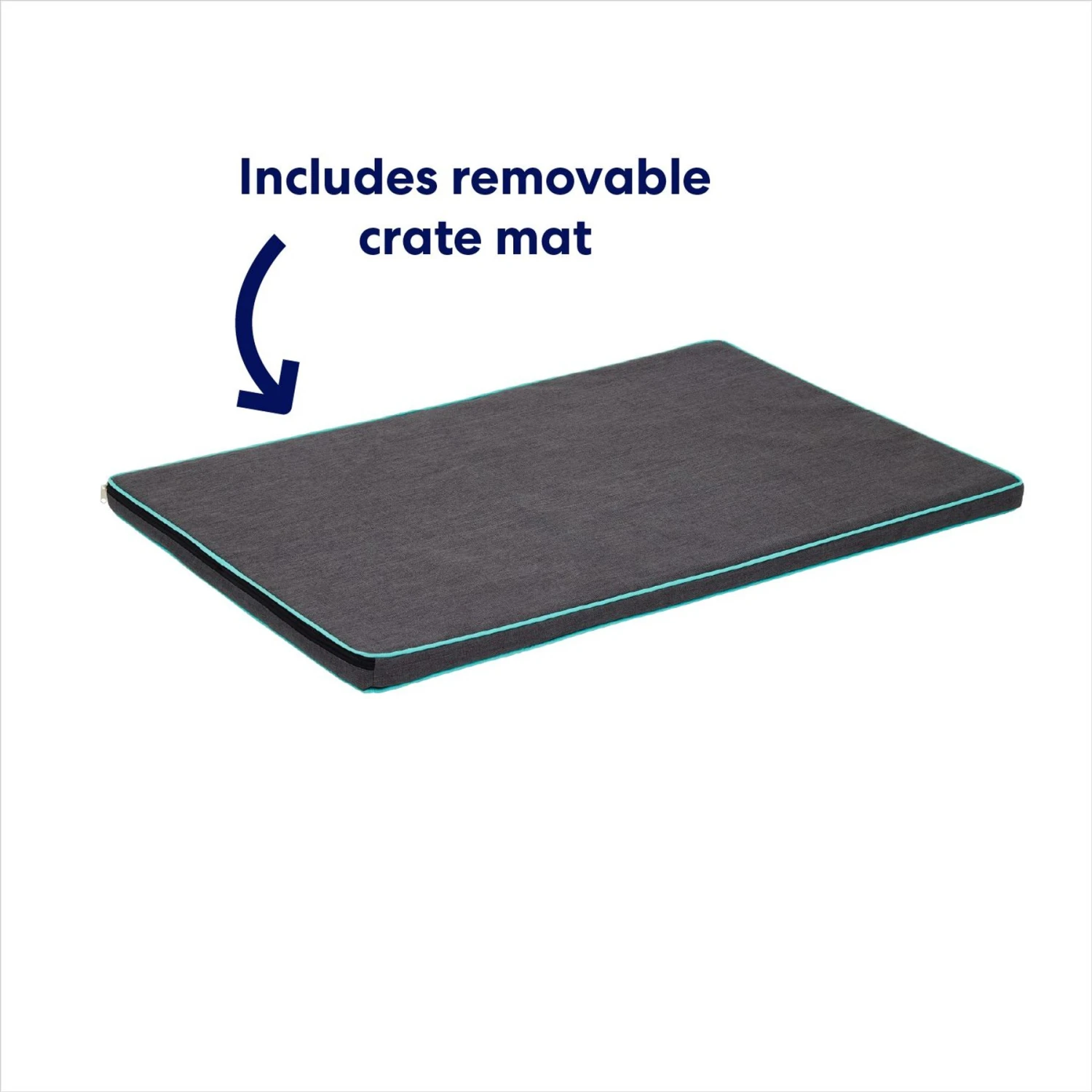 Give your dog a well-designed space just for them with this heavy-duty wire crate from Frisco by Chewy. You get everything you need to create a special spot just for them—the crate, a comfy mat, and a base pan. It’s designed to fit and work well in tighter spaces, with dual sliding doors on the front and side that take up less space than traditional swinging doors. Setting it up and taking it down is quick and easy, with no tools required—just unfold it and lock the panels in place to provide your pet the private space they need. The enhanced locking system simplifies the process of securing your dog’s spot down to one simple step to secure all three locks. Plus, teal accents give it a stylish appearance to complement the convenient functionality.